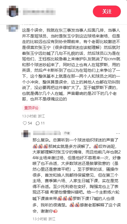 该球迷在社交媒体上解释,有激进的球迷对张玉宁喊不礼貌的话,浙江球员以为在骂他们,因此理论起来。与此同时,还有球迷在骂主帅罗斯·阿洛伊西,卢卡斯误会在骂他们,也过来争论。